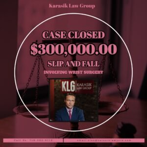 Karasik Law Group just closed a slip and fall case involving a wrist surgery for $300,000.00. Slip and fall accidents due to property owners’ failure in their duty to ensure the safety of their visitors are some of the most common personal injury cases across the nation. If you or your loved one have suffered serious injuries from a slip and fall, Karasik Law Group will fight for your right to compensation for every dollar you are entitled to under the law. Call us to today at 929-444-4444 to schedule a free consultation. And be sure to visit our website at www.karasiklawyers.com. At Leading Law Firm Karasik Law Group, winning matters. Win with us! We speak for the injured; our results speak for themselves.